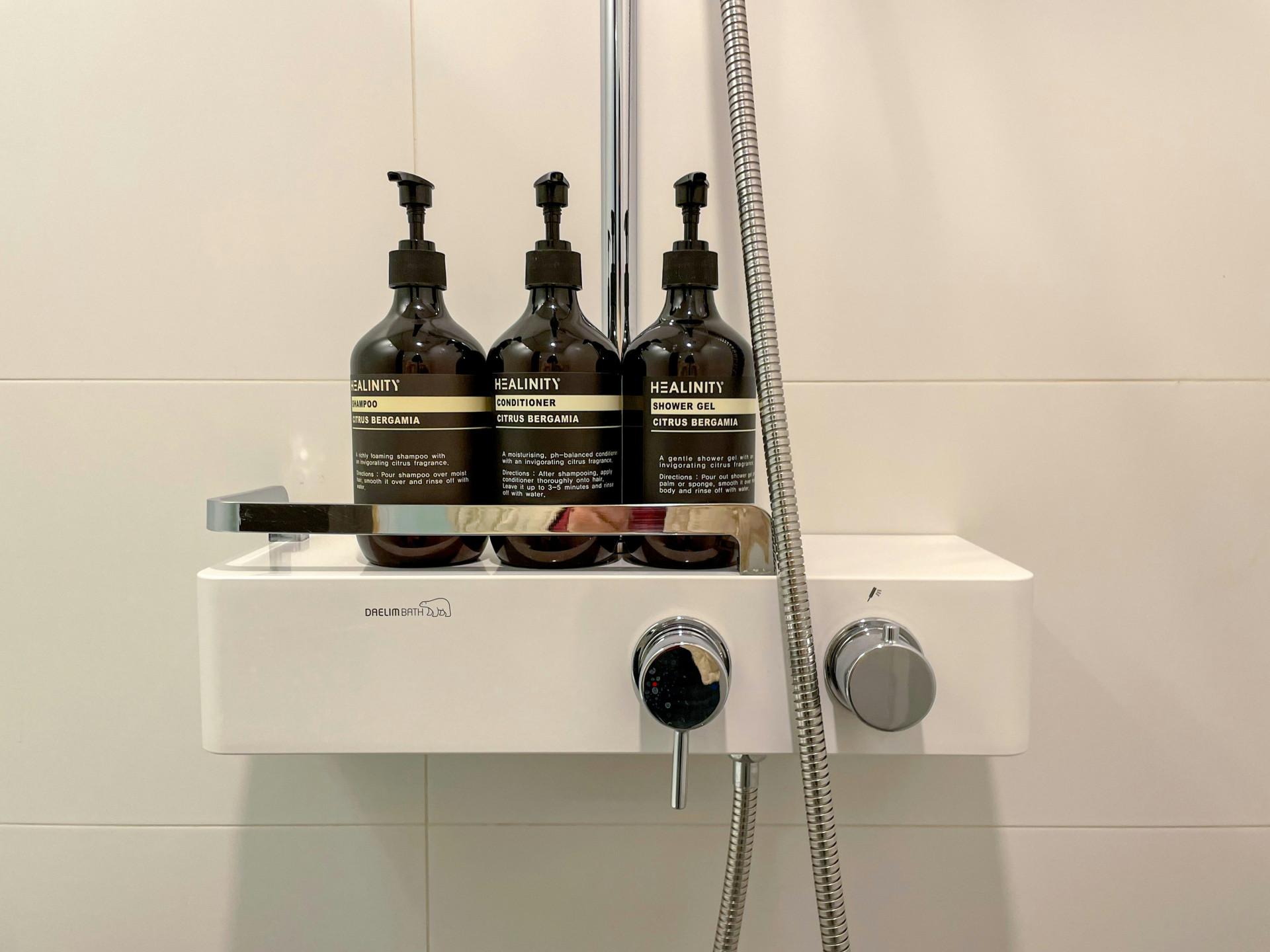 - Komplet brusesystem: Indeholder hovedbruser, håndbruser, termostat, bruserslange og stang.
